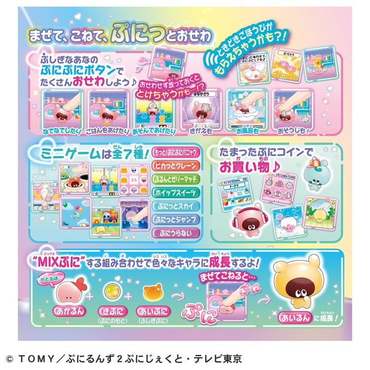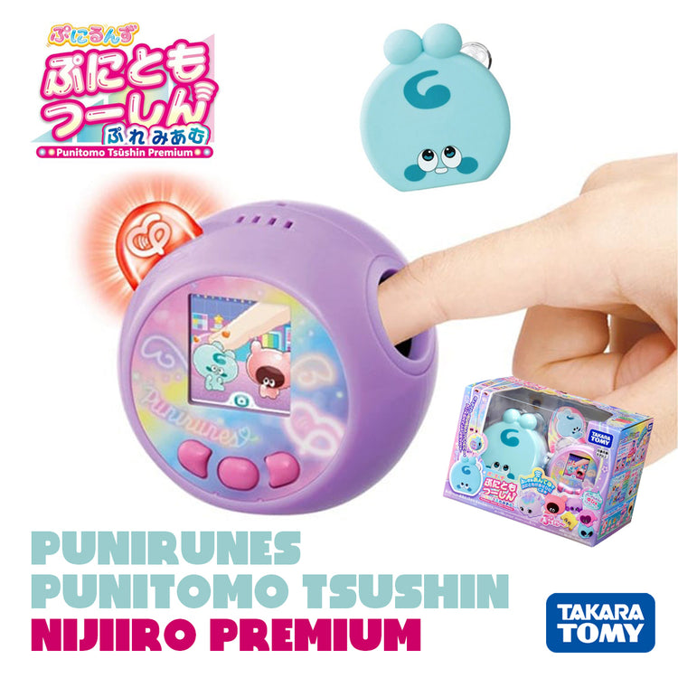 Take care of the squishy characters by directly touching them with your finger! The new "sensation" LCD toy "Punirunes" now comes with a communication play feature! When the mysterious antenna lights up in colorful colors, a "Punitomo" comes to play! The premium version, with accessories, is now available in a new "Niji-iro" (rainbow) themed design!