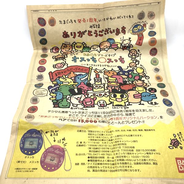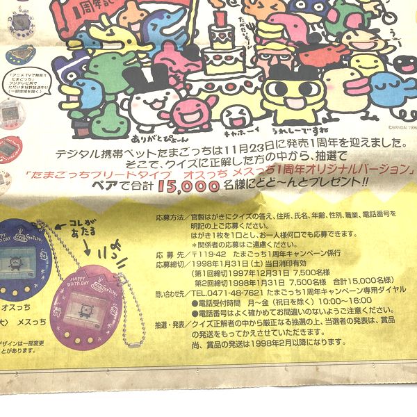 *Dies ist eine Anzeige für Tamagotchi, die am 23. November 1997 in einer japanischen Zeitung erschien. Es wird ein Quiz veranstaltet, um das erste Jubiläumsmodell des Osutchi Mesutchi zu verlosen.