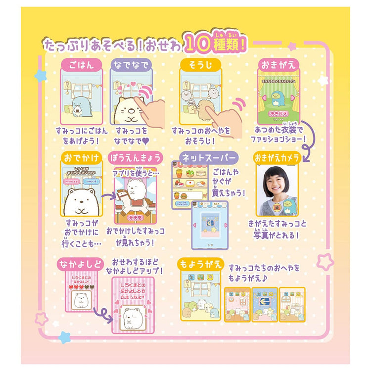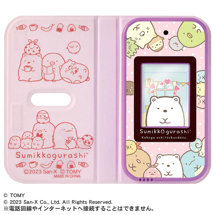Disfruta de 64 apps llenas de diversión con Sumikko, incluyendo cuidar de Sumikko, minijuegos, fotografía con cámara ¡y mucho más! ¡Reúne monedas y descarga tus apps favoritas! Personaliza tu smartphone a tu gusto♪ El dispositivo, que viene con una bonita funda magnética, es delgado, ligero y recargable. También incluye un cable USB para cargarlo.