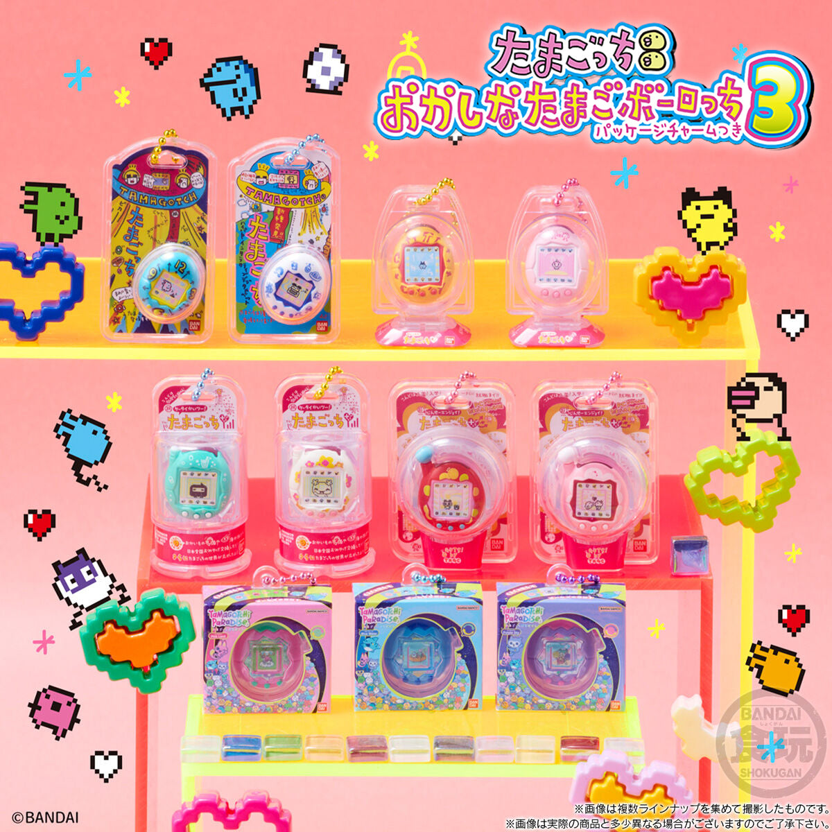 • 12 designs in total (including 1 secret variant), featuring designs from the original classic Tamagotchi to the latest Tamagotchi Paradise